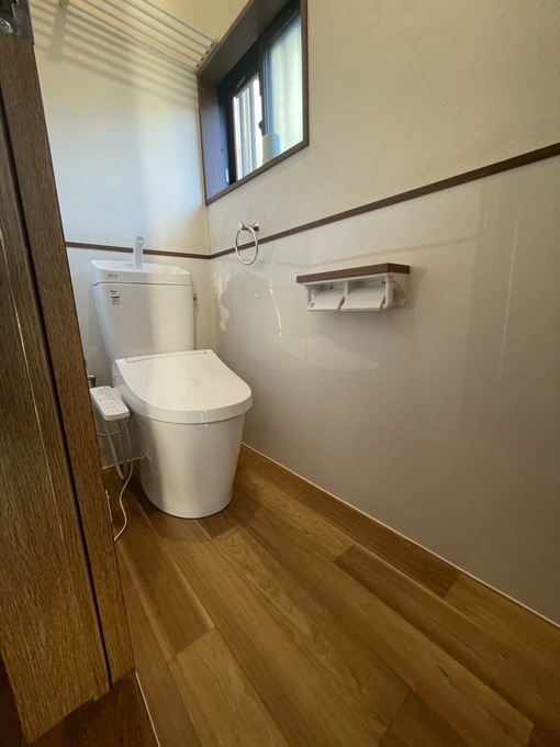 かなり雰囲気がガラっと変わりましたよね?!ポイントは、壁のタイル部分をキッチンパネルでカバーして、床をクッションフロアで上貼りした所です!キッチンパネルをホワイト系、床をフローリング調の柄にしたことで、全体的にウッドの部分が強調されて、おしゃれなデザインになりました。プラス、棚付きのペーパーホルダーもお客様の希望で、同系色を選びました。実は、トイレ入口のドアや廊下のフローリングの色に合わせて、トイレ内の木色を選んでいらっしゃいました。本当に素晴らしいセンスをお持ちです(´;ω;`)